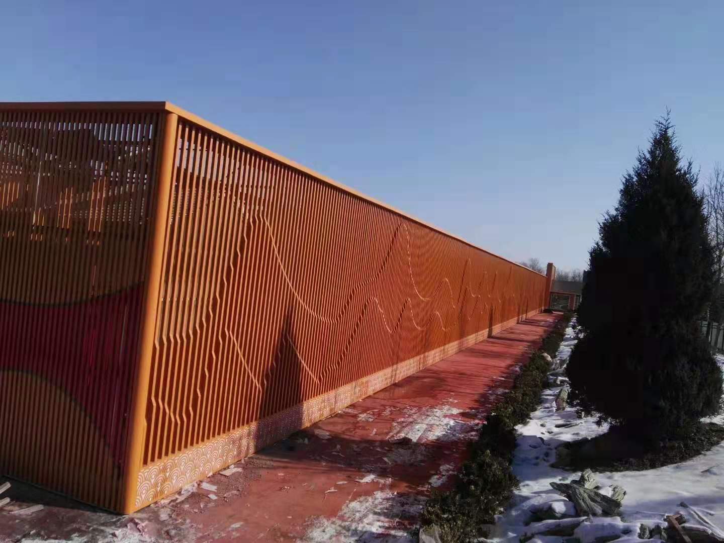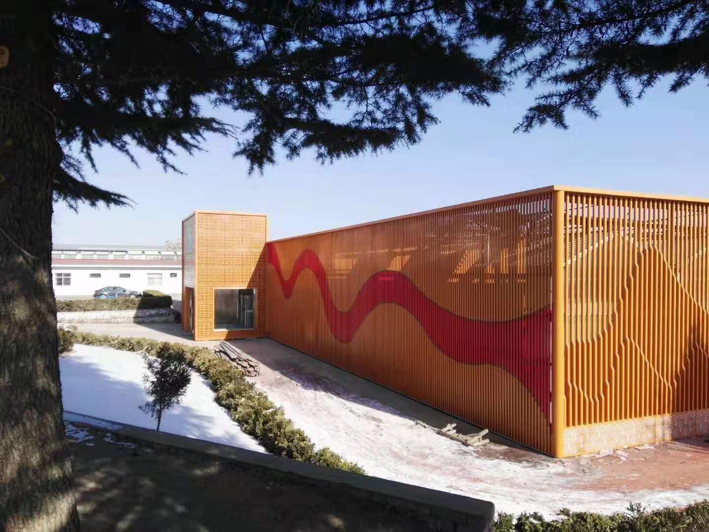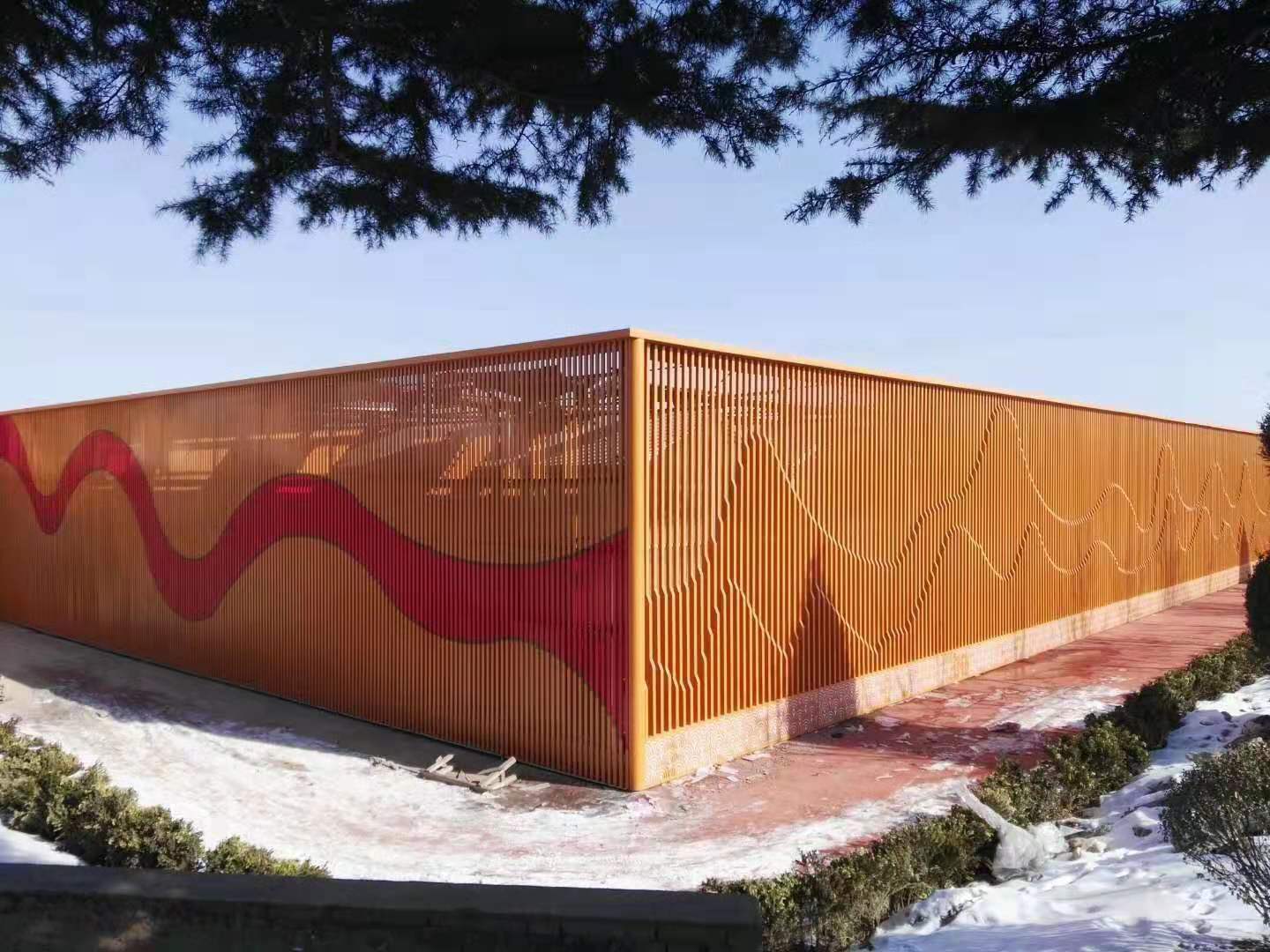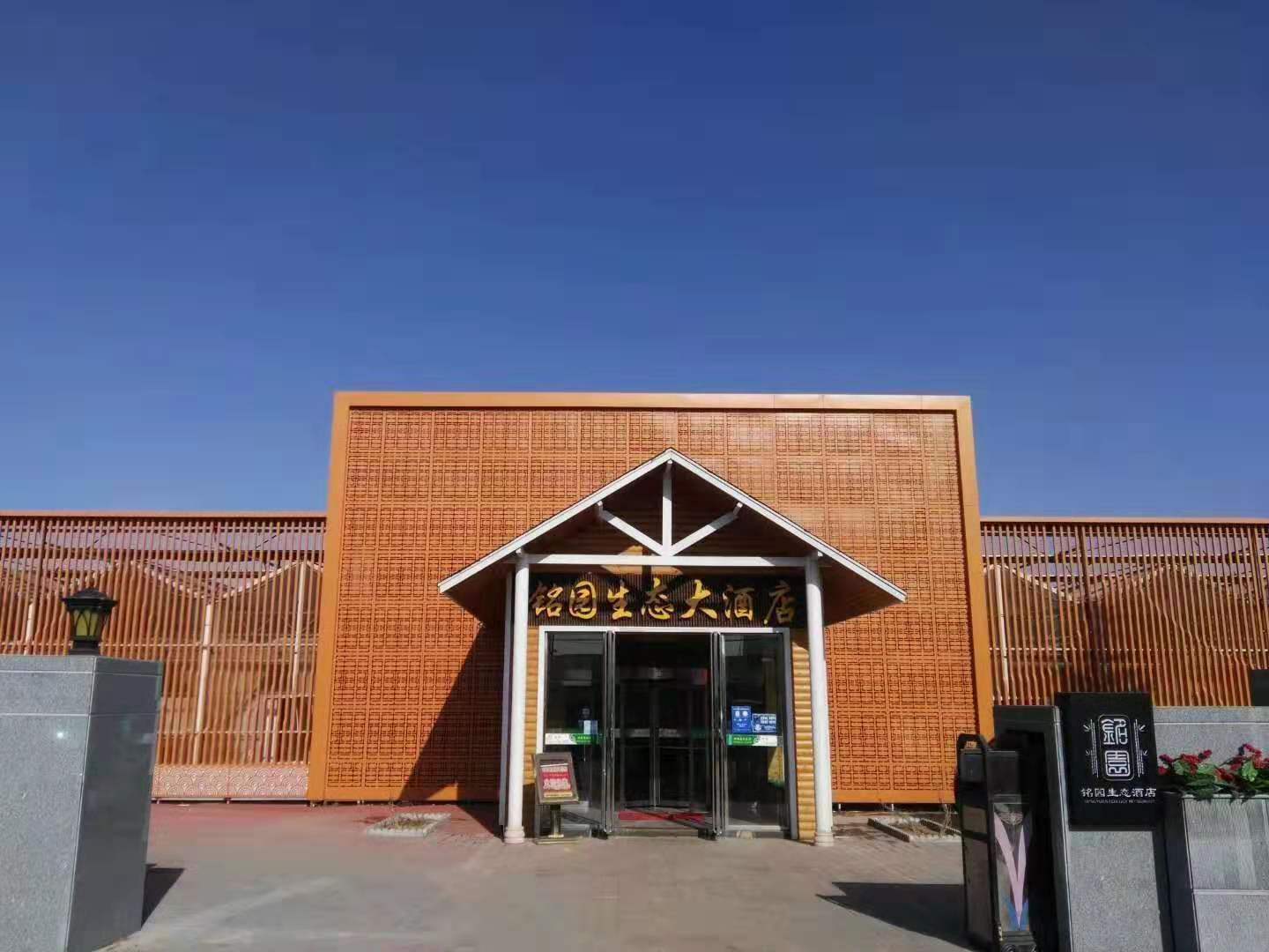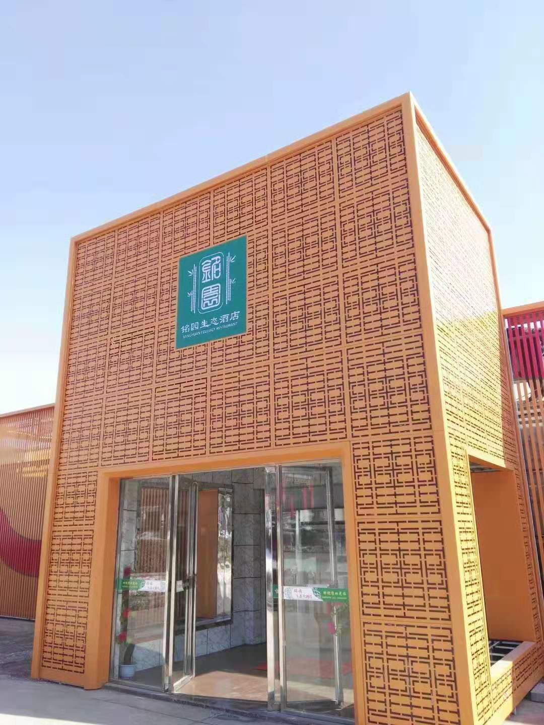 【銘園生態(tài)大酒店案例】 應(yīng)用產(chǎn)品:鋁窗花,藝術(shù)鏤空鋁單板,鋁方通,造型弧形鋁方通